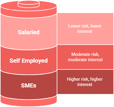 Loan Against Property (LAP) interest rates vary based on the type of customer—Salaried, Self-Employed, or SMEs—and several other key factors. The final rate offered depends on your net monthly income, employment or business stability, existing financial obligations (EMIs or loans), the type of property being pledged, and the LAP product you choose. Customers with strong financial profiles—such as consistent income, low debts, and good credit history—can enjoy the lowest possible interest rates, making their loan more affordable and easier to repay.